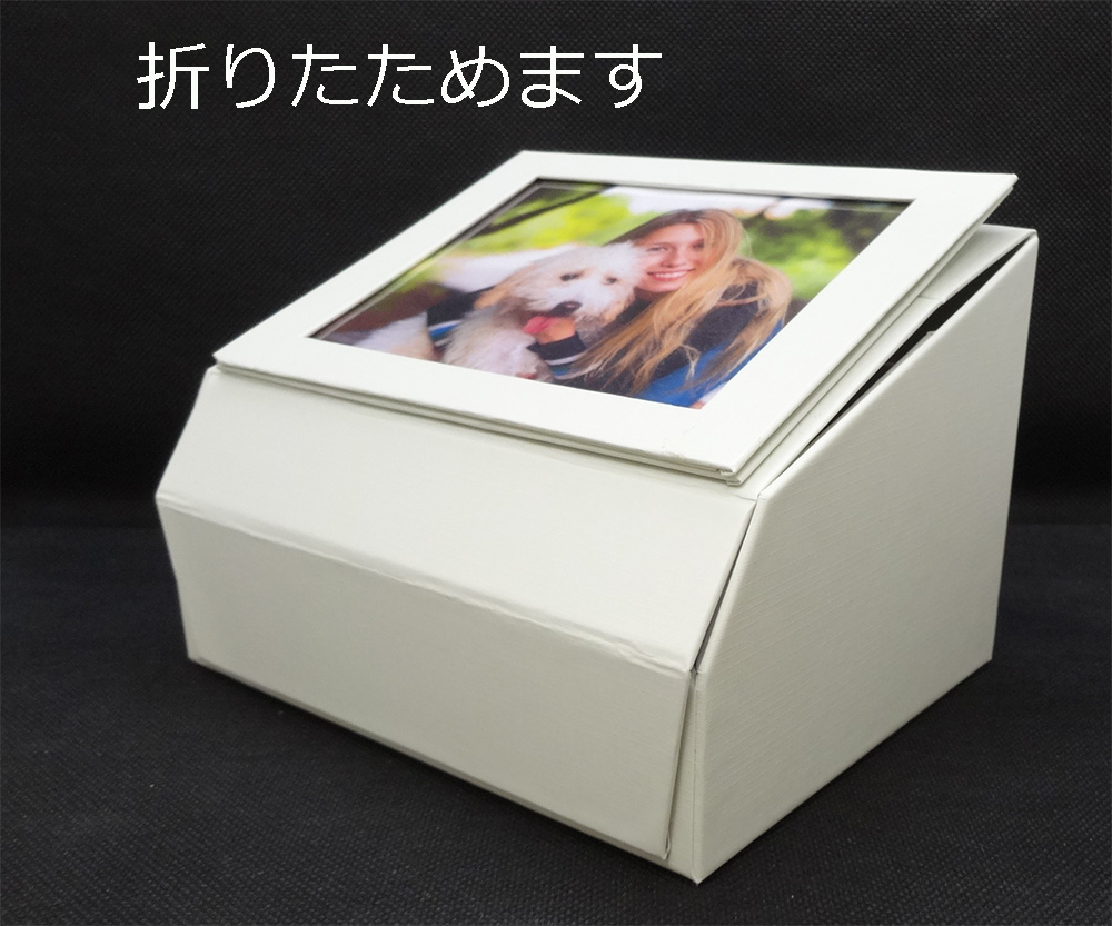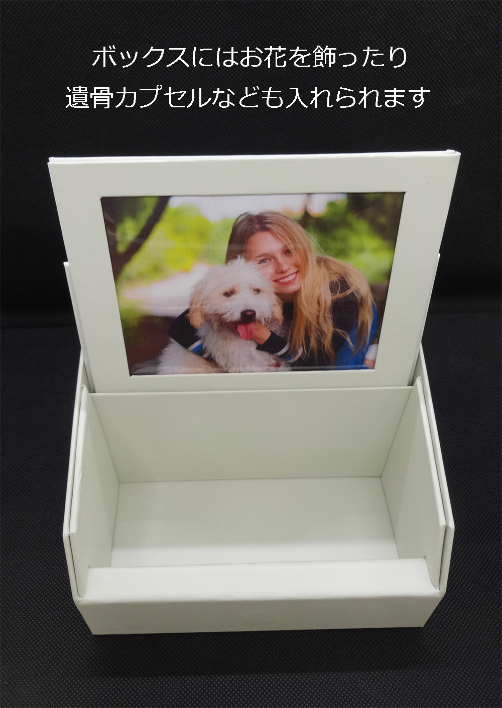 紙製のフォトフレームボックスですが、とても丈夫に出来ています。手前のポケット部分にお花を飾ったり、遺骨カプセルや小物を入れることが出来ます。