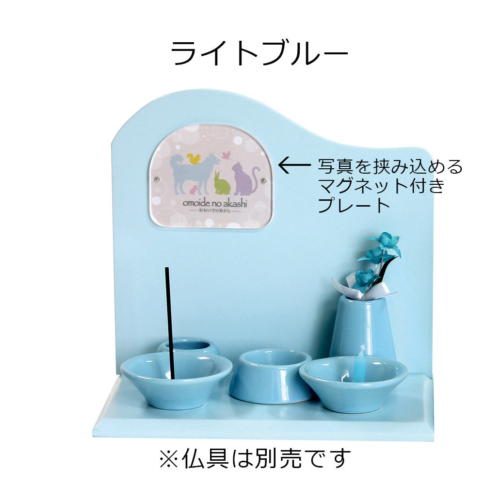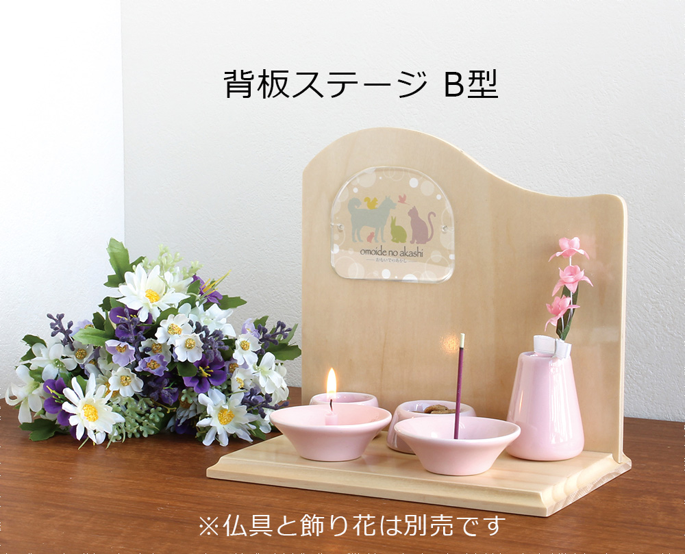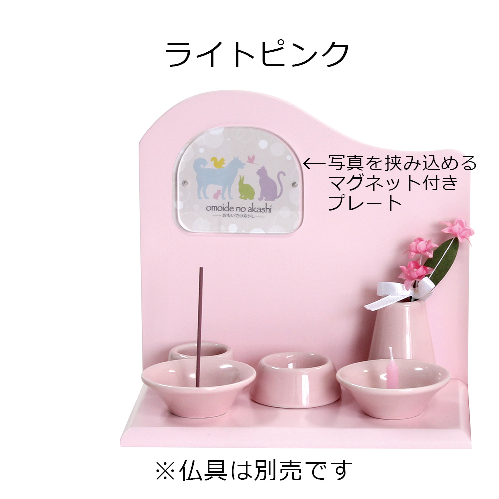 小ぶりで可愛らしい供養ステージ。背板のプレートにペットちゃんの写真を挟み込むことができます。ナチュラル・ライトピンク・ライトブルーの3色がございます。(写真はナチュラル)